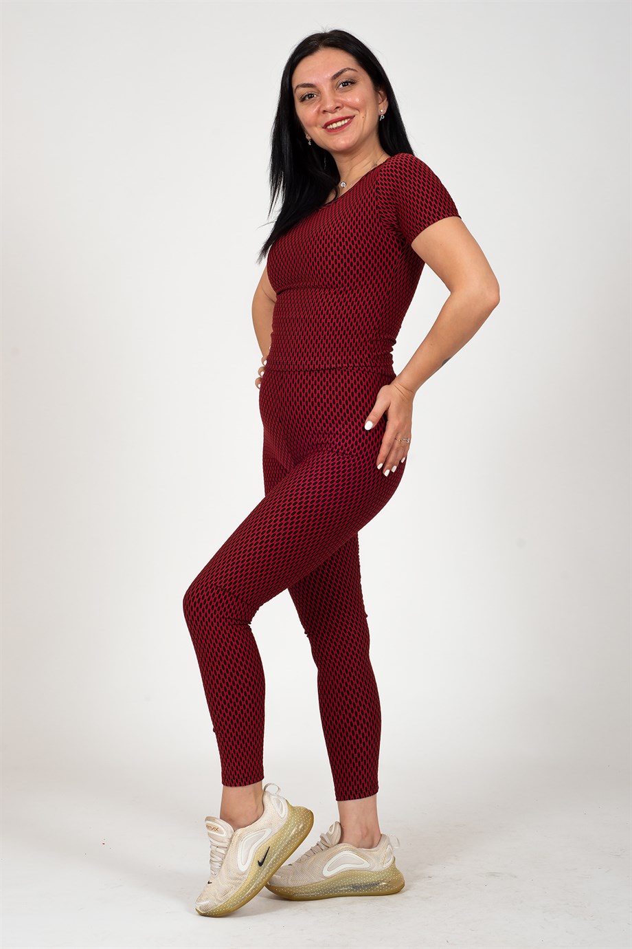 Bordo Minik Kare Desenli Bluz Tayt Brezilya Takım