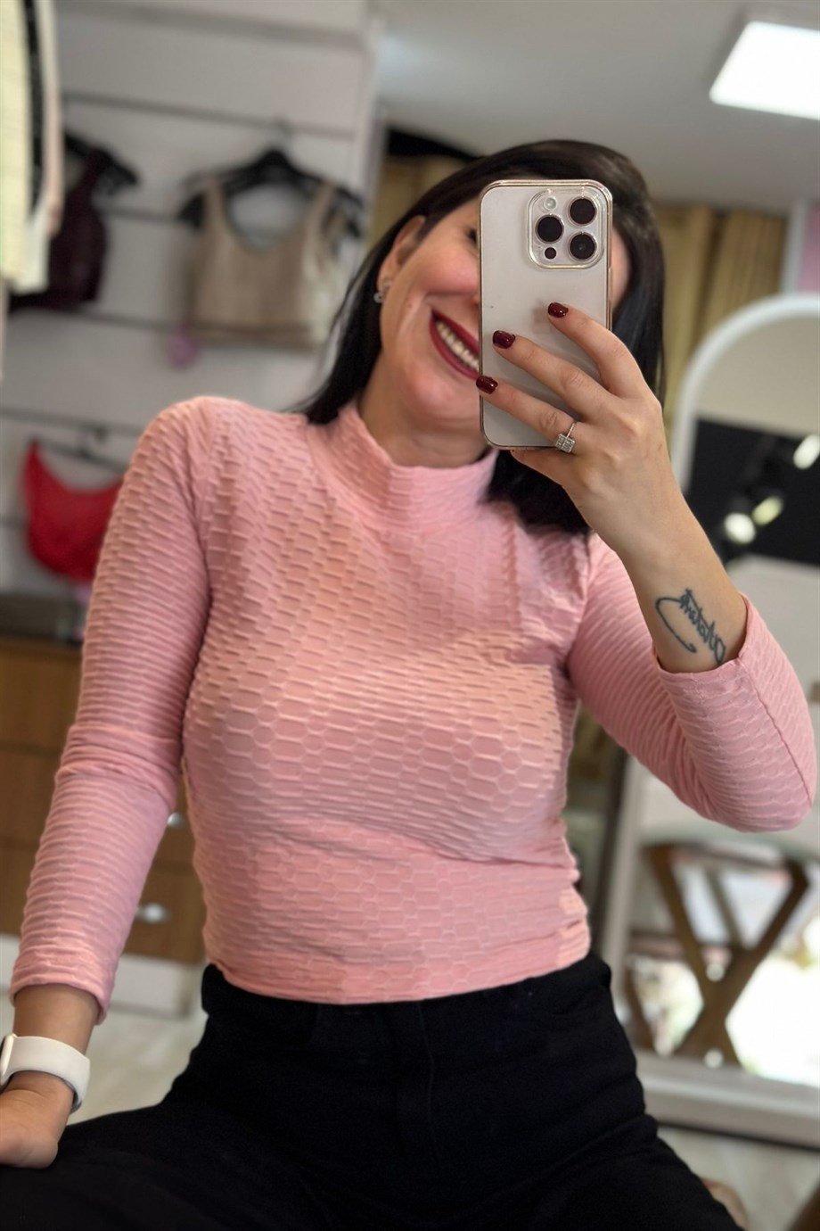 Dik Yaka Petek Desenli Likralı Bluz Pudra