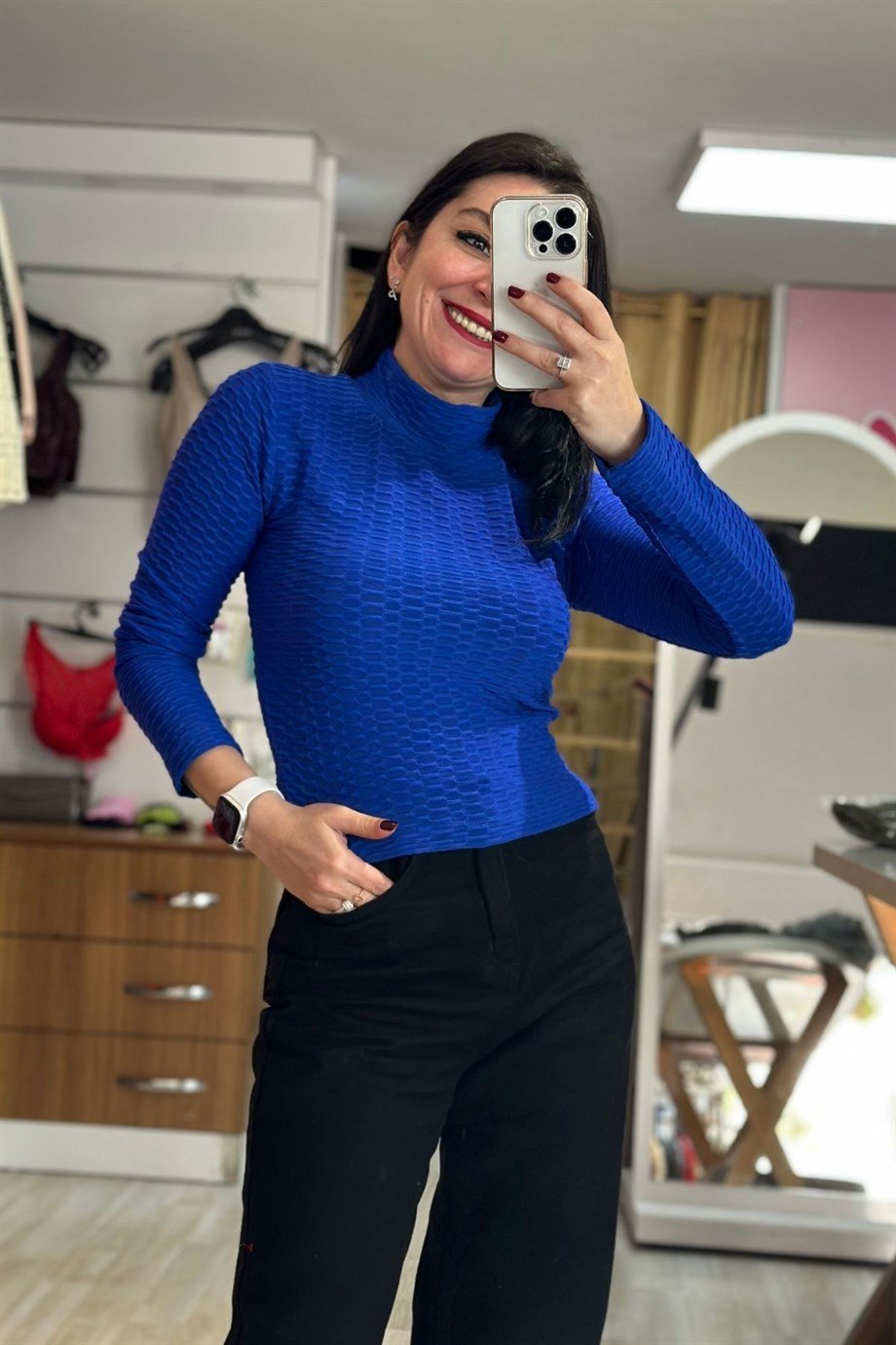 Dik Yaka Petek Desenli Likralı Bluz Saks