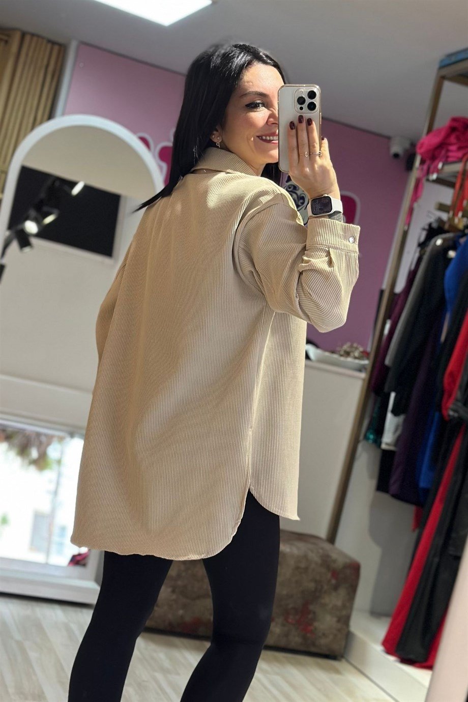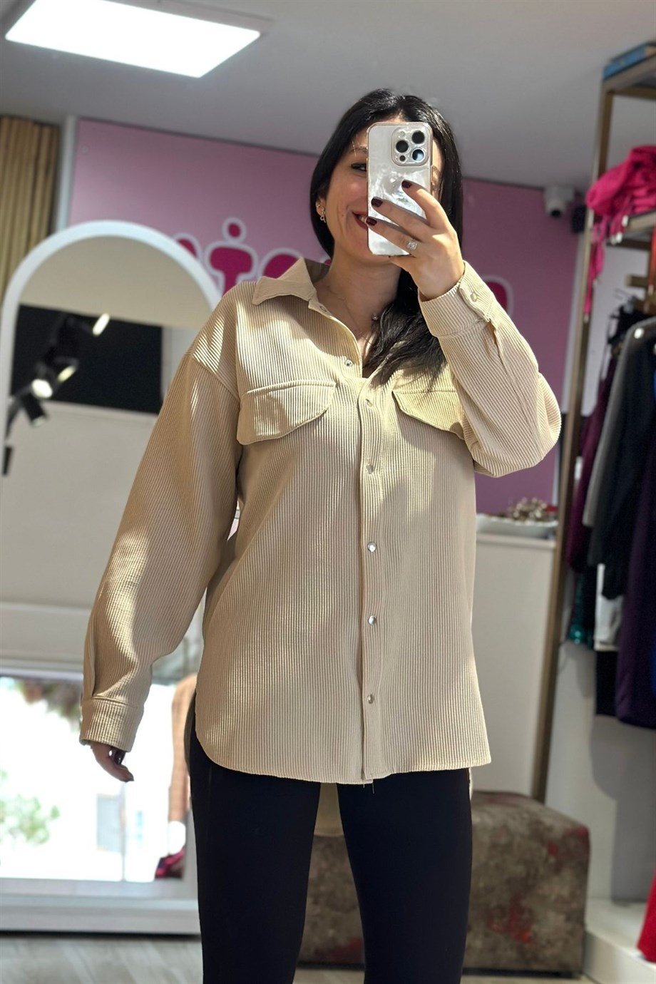 Kapak Cep Detaylı Çıtçıt Kapamalı Uzun Gömlek Bej (MZR20394)